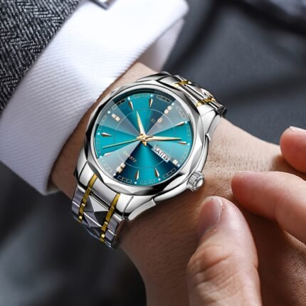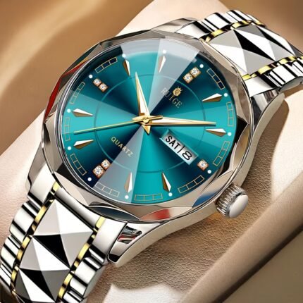 RUIGE Men’s Luxury Quartz Watch with Luminous Teal Dial, Chronograph, Date & Day Display, Stainless Steel Band with Rhinestone Accents – Fashionable Holiday Gift for Christmas, Thanksgiving, Lunar New Year, Festive Wristwatch | Sophisticated Design | Gold
