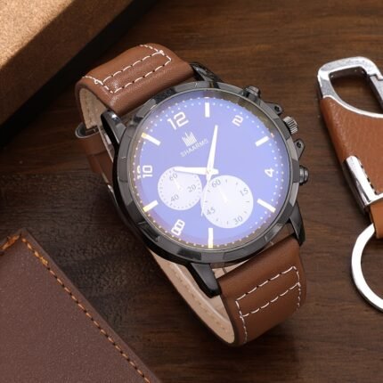 6pcs Men’s Business Brown Faux Leather Watch Set with Wallet, Belt, Keychain, Pen & Fashion Glasses – Luxury Gift Box Included – Perfect for Valentine’s, Easter, Ramadan