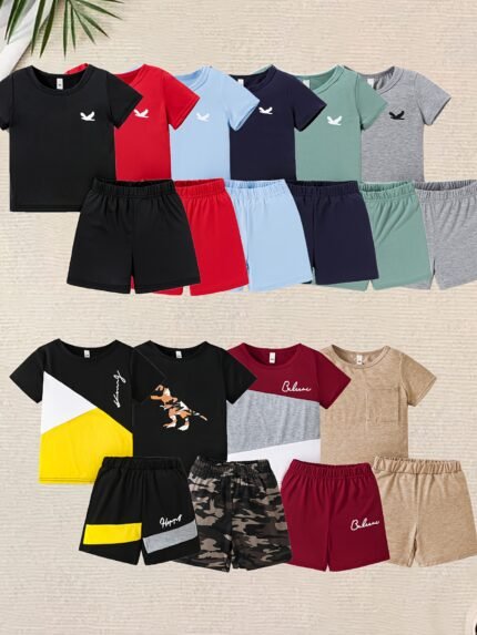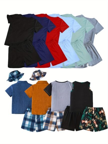 20-Piece Boys’ Summer Casual Fashion Set – Includes 10 Stylish Tops and 10 Matching Shorts – Multi-Pack Clothing Collection for Daily Wear & Outdoor Activities