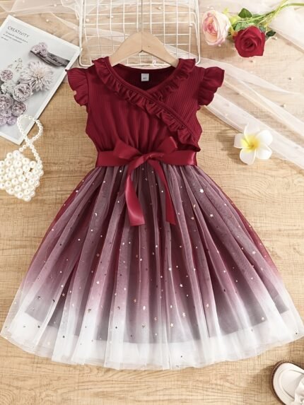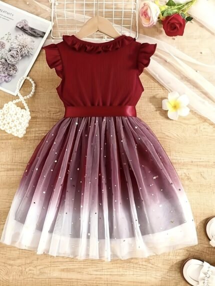 [Vintage Sequin Dress] Vintage-Inspired Sequin Mesh Ruffle Dress | Elegant Starry Sky A-Line Princess Skirt for Girls – Sleeveless, Valentine’s Day Gift, and Summer Parties