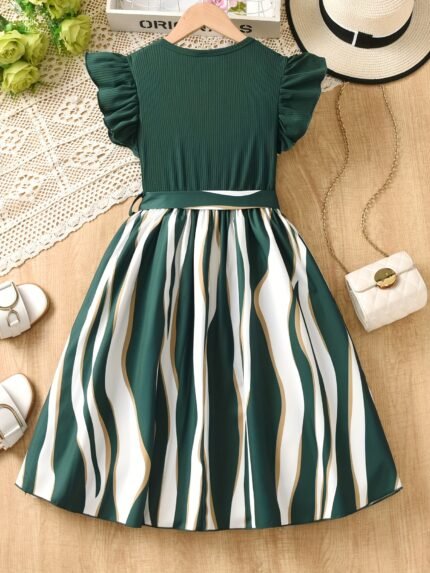 [Bohemian Dress] Bohemian Dark Green & White Stripes Teen Girls’ Geometric Print Dress | A-Line Flared Skirt, Round Neck, Ruffled Sleeves & Adjustable Bow Belt – Summer Casual Dress