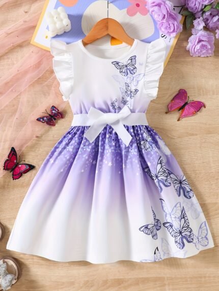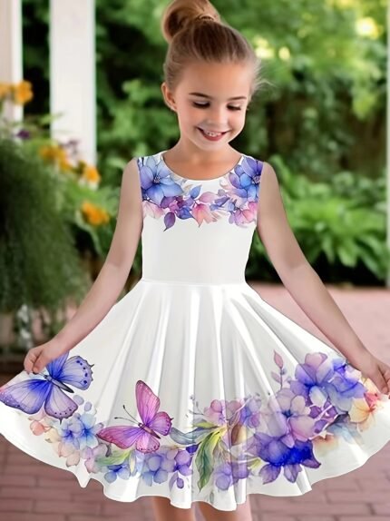 [Butterfly Print | Playful] Sleeveless Ruffle Girls’ Butterfly Print Dress | Casual Knit, White with Pink and Purple Butterfly Design | Perfect for Spring/Summer, Beach, Holiday, and Party Wear