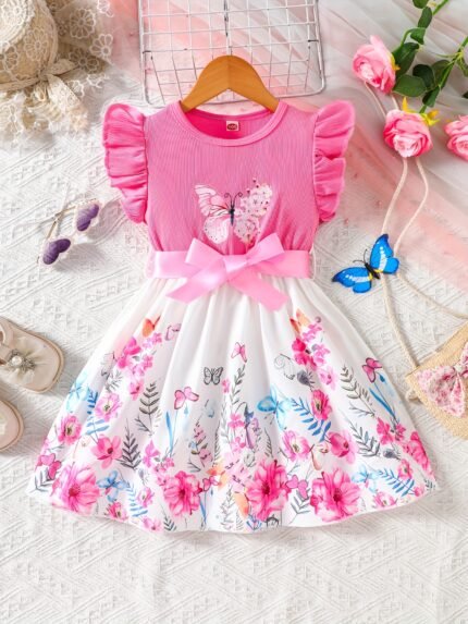 Adorable Girls’ Summer Butterfly Print Sleeveless Dress with Ruffled Trim & Belt – Knee-Length, Pink Floral & Butterfly Design, Perfect for Parties & Casual Wear, Party Wear Youngsters | Elegant Girls’ Attire | Polyester Blend