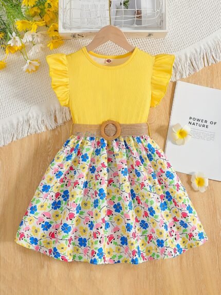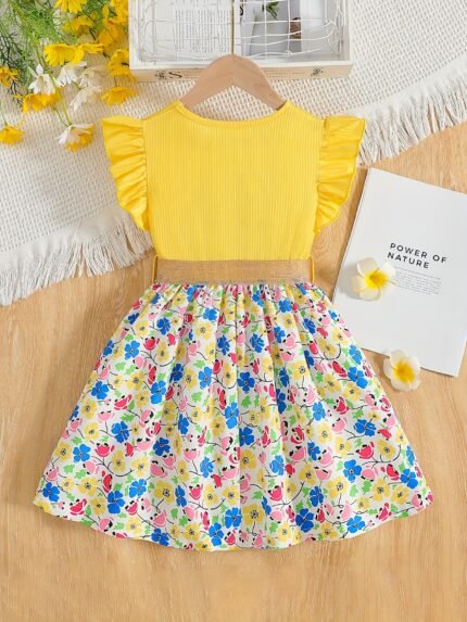 Girls’ Elegant Floral Print Dress with Ruffle Sleeves – Bright Yellow Top & Multicolor Floral Skirt, Perfect for Summer, Adds a Touch of Style to Youngsters’ Outfits, Casual Summer Dress | Ruffle Sleeve Dress | Vibrant Skirt Design, Floral Dres