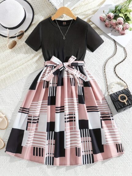 Girls’ Summer Geometric Print Dress – Casual Elegant Style, Soft & Comfortable Short Sleeve with Lace-Up Detail, Flared Hem, Perfect for Outdoor Wear, Youngsters’ Clothing | Elegant Shorts | Non-Stretch Fabric