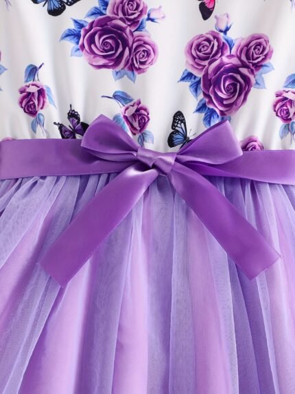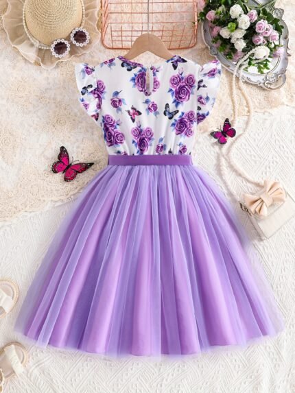 An Elegant Dress for Girls Featuring Floral And Butterfly Prints with Ruffled Sleeves And a Tie, This Mesh Princess Dress Is Perfect for Everyday Wear And Casual Vacation Parties, Suitable for Toddlers And Children in Summer.