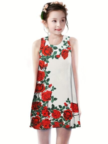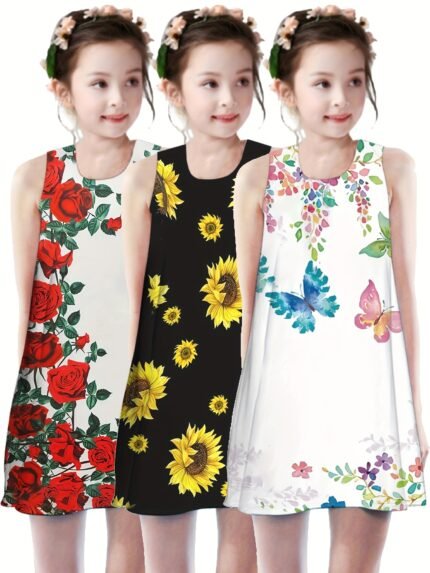 Butterfly Floral Pattern Sleeveless Crew Neck Ruffle Dress For Girls, Casual Comfy Dress Summer Gift, Girls’ Clothing
