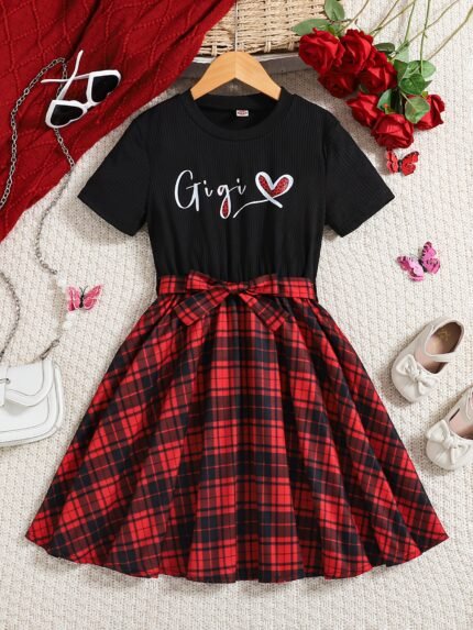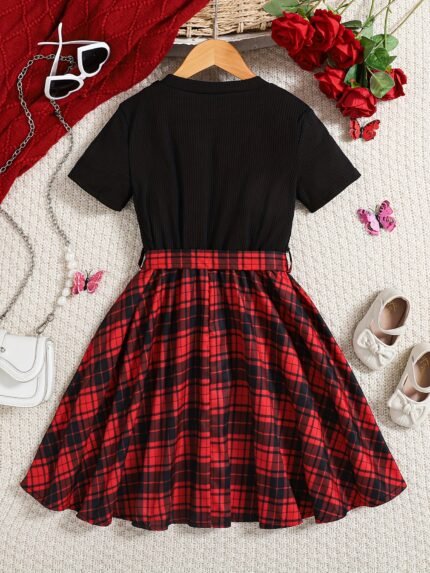 Girls’ Summer Plaid Patchwork Dress with Asymmetrical Hem & Heart Print – Short Sleeve, Round Neck, Vibrant Color Block Design, Machine Washable, Mid-Length Casual Style, Smooth Texture Fabric, Clothes for Girls