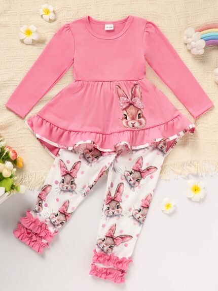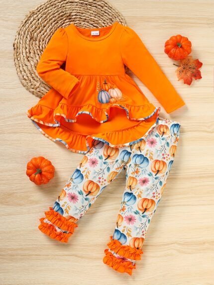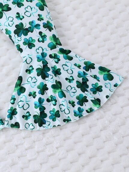 Adorable Girls’ Holiday Outfit – Ruffled Hem Long Sleeve Top & Flared Pants with Festive Print – Perfect for Valentine’s, St. Patrick’s Day, Easter & Outdoor Party Wear