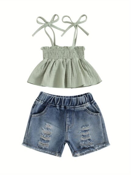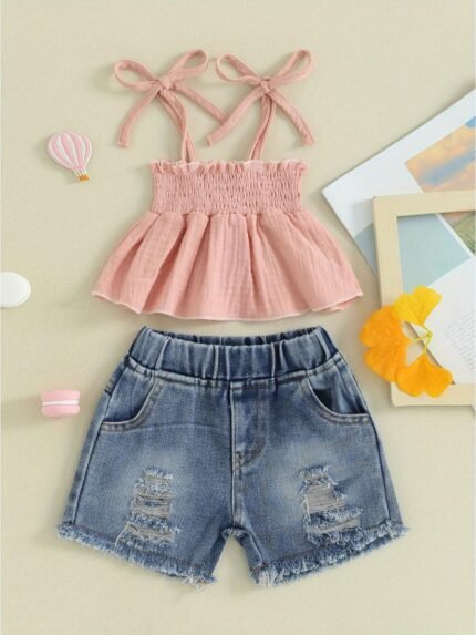 Summer Two-Piece Outfit for Girls – Tie-Up Pleated Camisole & Distressed Denim Shorts – Perfect for Outdoor Wear