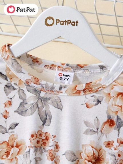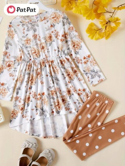 PatPat 2-Piece Kid Girl Outfit – Floral Print High-Low Long Sleeve Tee & Polka Dot Leggings Set – Stylish Outdoor Wear for Spring and Fall