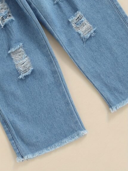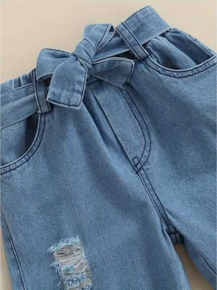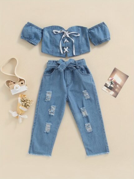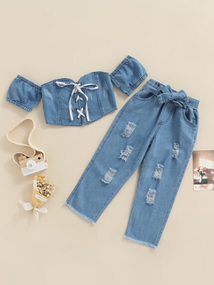 Kid Girl Denim Outfit Set – Off-Shoulder Short Sleeve Lacing Crop Top with Ripped Jeans – Perfect for Outdoor Wear