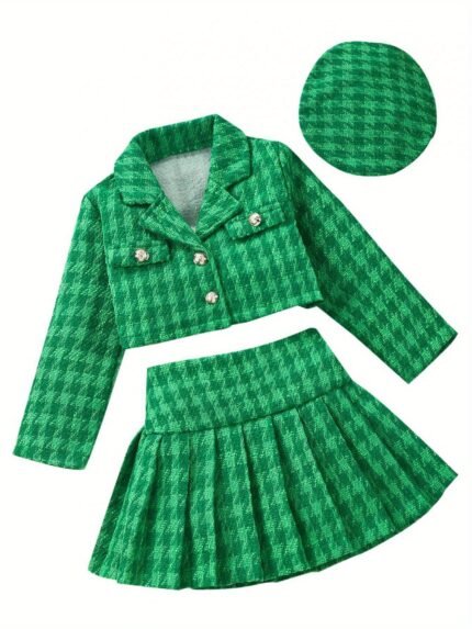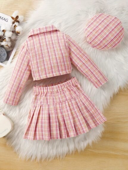Girls 3-Piece Autumn Outfit – Long Sleeve Button-Up Coat, Pleated Plaid Skirt & Matching Hat – Stylish Fall Clothing Set