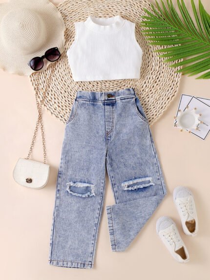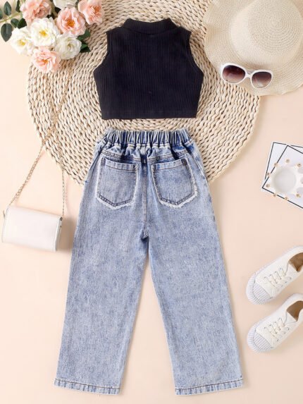 Toddler Girls’ Fashion Outfit – Solid Color Tank Top & Jeans Set – Comfortable & Stylish Summer/Spring Clothes for Girls 2-7T