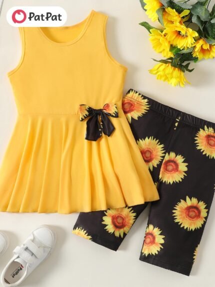 PatPat 2-Piece Girls’ Outfit – Sweet Bowknot Ruffled Sleeveless Top & Floral Print Leggings Set – Perfect for Spring & Summer Outdoor Wear