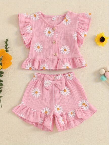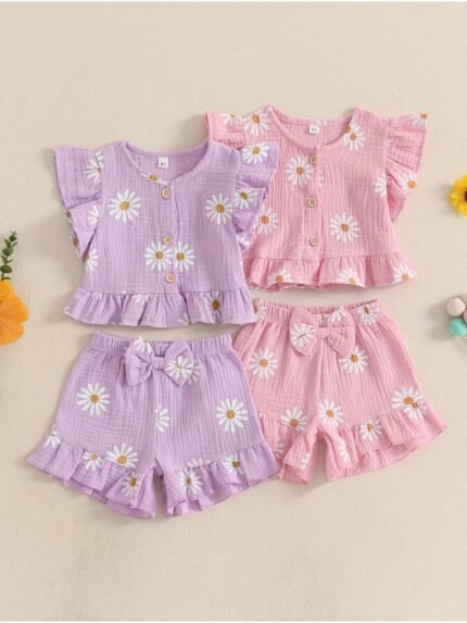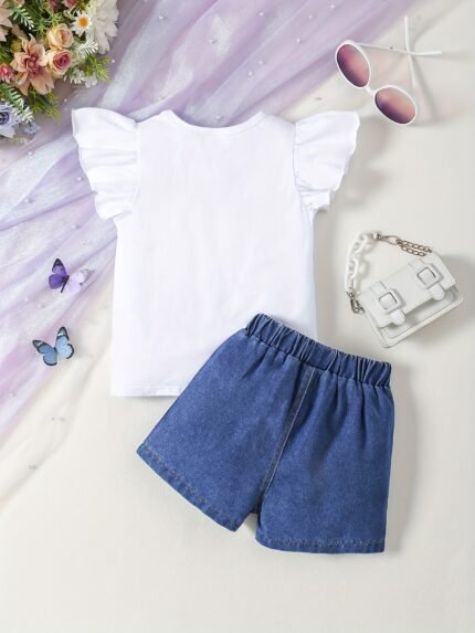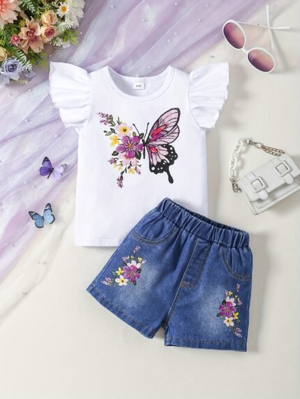 Girls’ Summer 2-Piece Set – Butterfly & Floral Print Lotus Leaf Sleeve T-Shirt with Denim Floral Print Shorts – Casual Outdoor Fashion Outfit