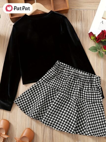 atPat 2-Piece Set for Girls – Velvet Long-Sleeve Crop Tee & Houndstooth Bowknot Skirt – Stylish Fall/Winter Outfit