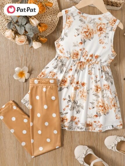 PatPat Girls 2-Piece Outfit – Floral Print Sleeveless Dress with Bow & Polka Dot Leggings – Soft Spring/Summer Clothing for Girls Ages 2–12, Perfect for Outdoor Wear