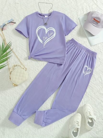 Girls’ Summer 2-Piece Set – Love Pattern T-Shirt & Casual Pants – Korean Fashion Style Outfit
