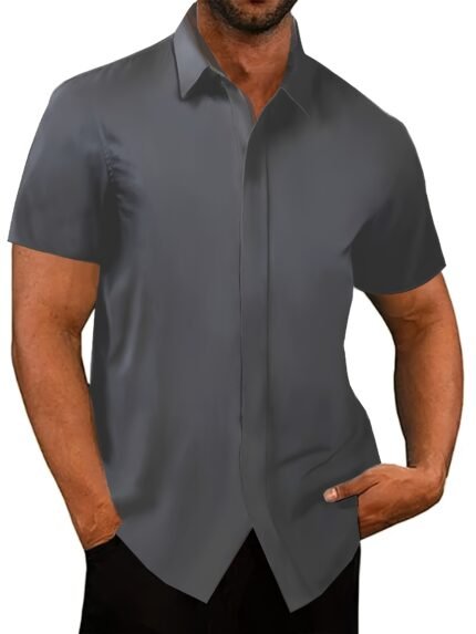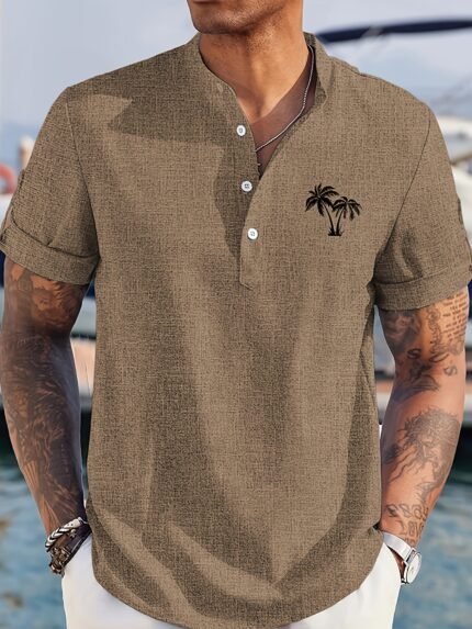 Men’s Casual Mandarin Collar Short Sleeve Shirt, 100% Polyester Solid Color Non-Stretch Woven Fabric, Regular Fit with Button Details and Print Sleeves for Summer