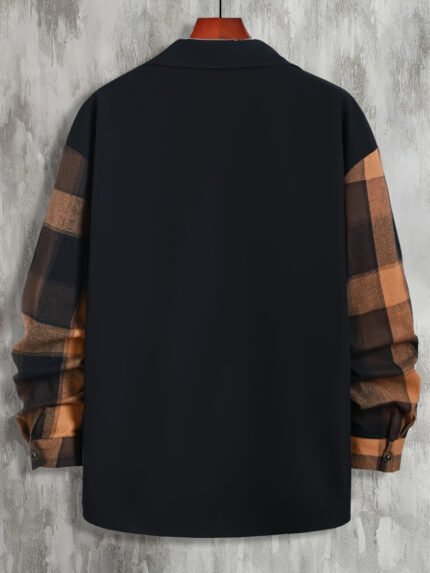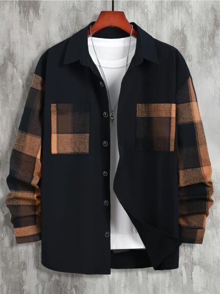 Men’S Casual Plaid Pocket Long Sleeve Shirt, Polyester 100%, Skinny Fit, Woven Fabric with Slight Stretch, Lapel Collar, Regular Sleeve, Color Block Detail, Classic Business Top for Fall/Winter, 120g/m²