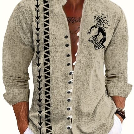 Men’S Casual Beige Mandarin Collar Shirt with 3D Tribal Totem Print, 100% Polyester Woven Fabric, All-Season Regular Fit with Buttons, Non-Stretch 120gsm – Ethnic Style Outdoor Top