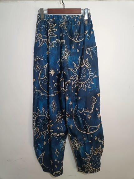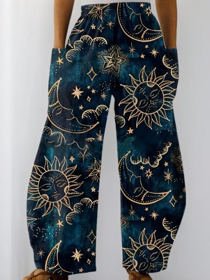 Plus Size Starry Night Pants – Sun & Moon Print, Wide-Leg with Pockets