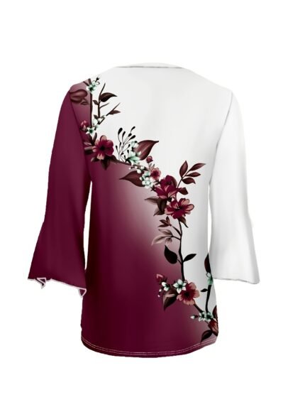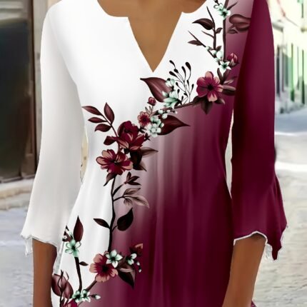 [180g/m² V-Neck Floral Blouse] Women’S Floral Gradient Blouse, Casual Polyester Knit Fabric, 180g/m², All Season V-Neck Long Sleeve Top