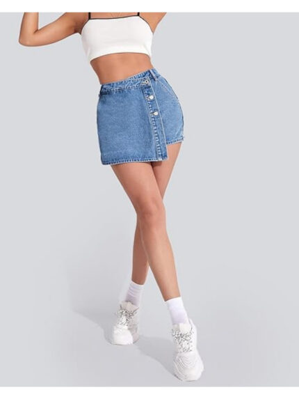 Denim Shorts Women Casual High Waisted Solid Button Up Asymmetrical Denim Jean Skort Skirt Mini Shorts