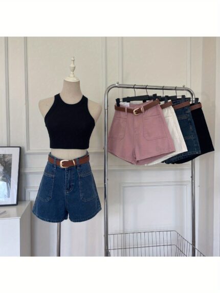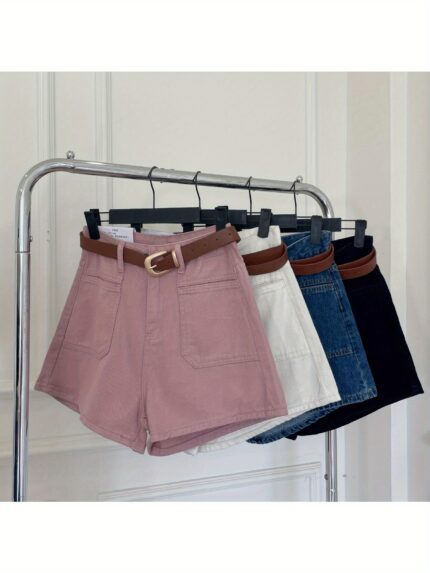 Women’s High-Waisted A-Line Denim Shorts – Summer 2024 Fashion, Versatile Korean Style Wide-Leg Hot Pants, White & Pinkish-Beige Jean Shorts with Adjustable Belt, Casual Streetwear for Women, Adjustable Fit Shorts | Buckle Detail Shorts | Classic Belted W