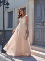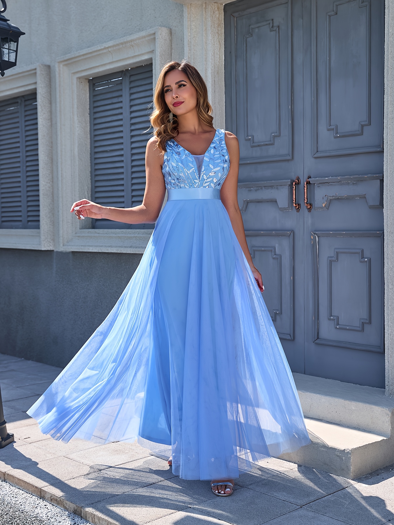 The package contains one dress. It is made from 100% polyester for a comfortable feel. The design features a V-neck, embroidered leaves, a high waist, and a long mesh skirt. This dress is ideal for occasions such as weddings, engagements, parties, and cocktails. You can pair it with a jacket to create a stylish blend of cool and elegant aesthetics.